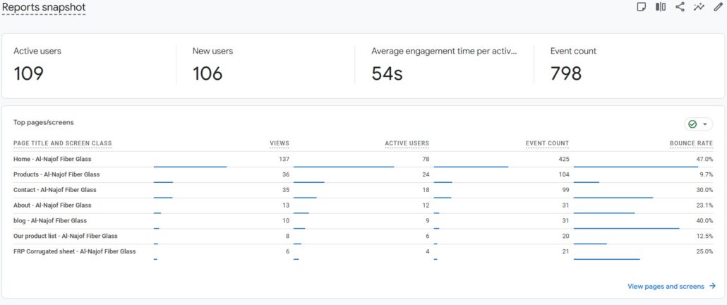 - Titles & meta descriptions: From cursory view, titles may be generic (e.g., “Home – Al-Najof Fiber Glass”) which do not fully leverage keyword opportunities (e.g., “Fiberglass Manufacturer Dammam | Al-Najof Fiber Glass”).